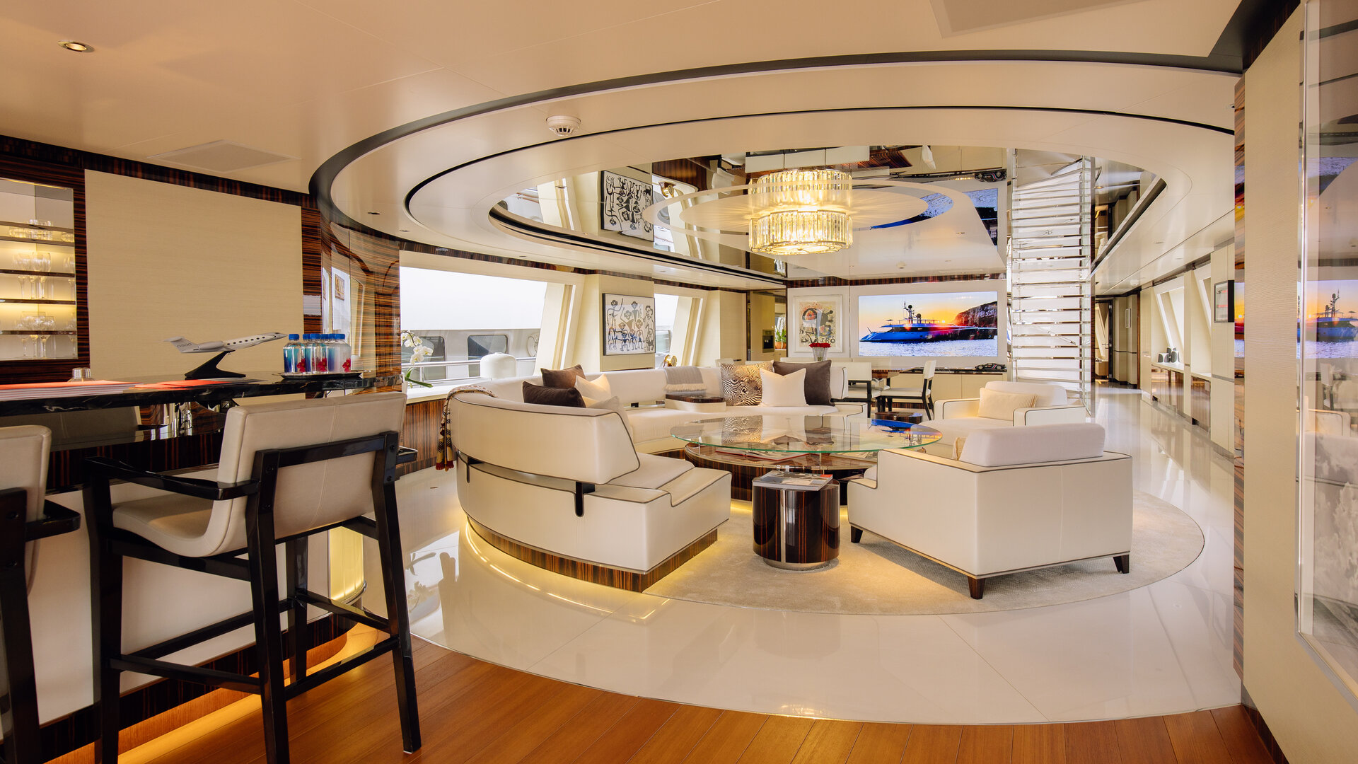 The main salon is a standout feature, with innovative rotating seating that allows guests to take full advantage of the breathtaking panoramic views offered through her oversized windows. This space is bathed in natural light, creating a bright and open atmosphere. A magnificent bar extends from the main salon onto the aft deck, making it an ideal setting for social gatherings and evening cocktails.