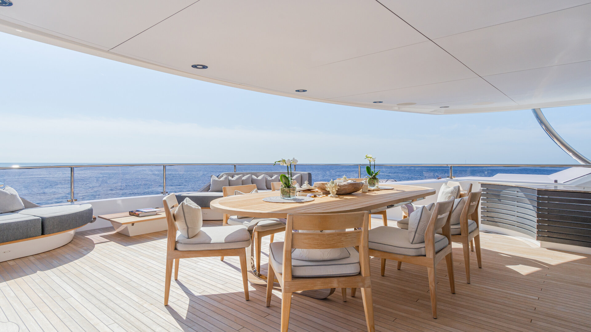 The exquisite main salon is wrapped in floor-to-ceiling windows and filled with beautiful, plush furniture. Fold-out balconies on either side allow you to feel closer to the sea. The open-plan lounge leads to a formal dining table that seats eight and has access to the aft deck through sliding glass doors. The exterior curved sofas that overlook the stern are the perfect spot to enjoy an after-dinner drink or wake up with your morning coffee as you take in the infinity views.