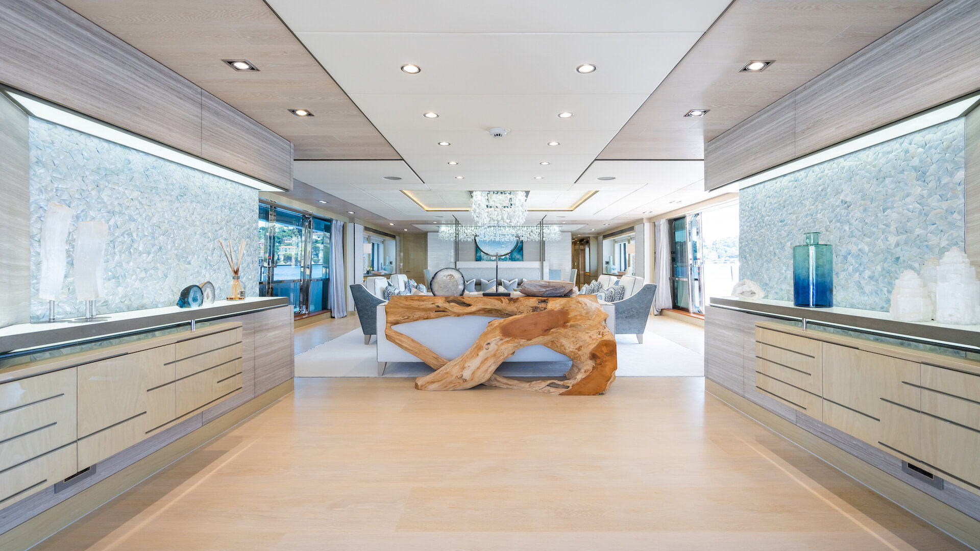 The interiors of the THUMPER motor yacht were inspired by the beach clubs of Miami and Ibiza and feature leathers, pale timbers, metals, semi-precious stones and an abundance of unique art pieces commissioned specifically to go on board. The main salon is a highlight, finished with contemporary chandeliers and an eclectic look that combines stone floors with silk fabrics.