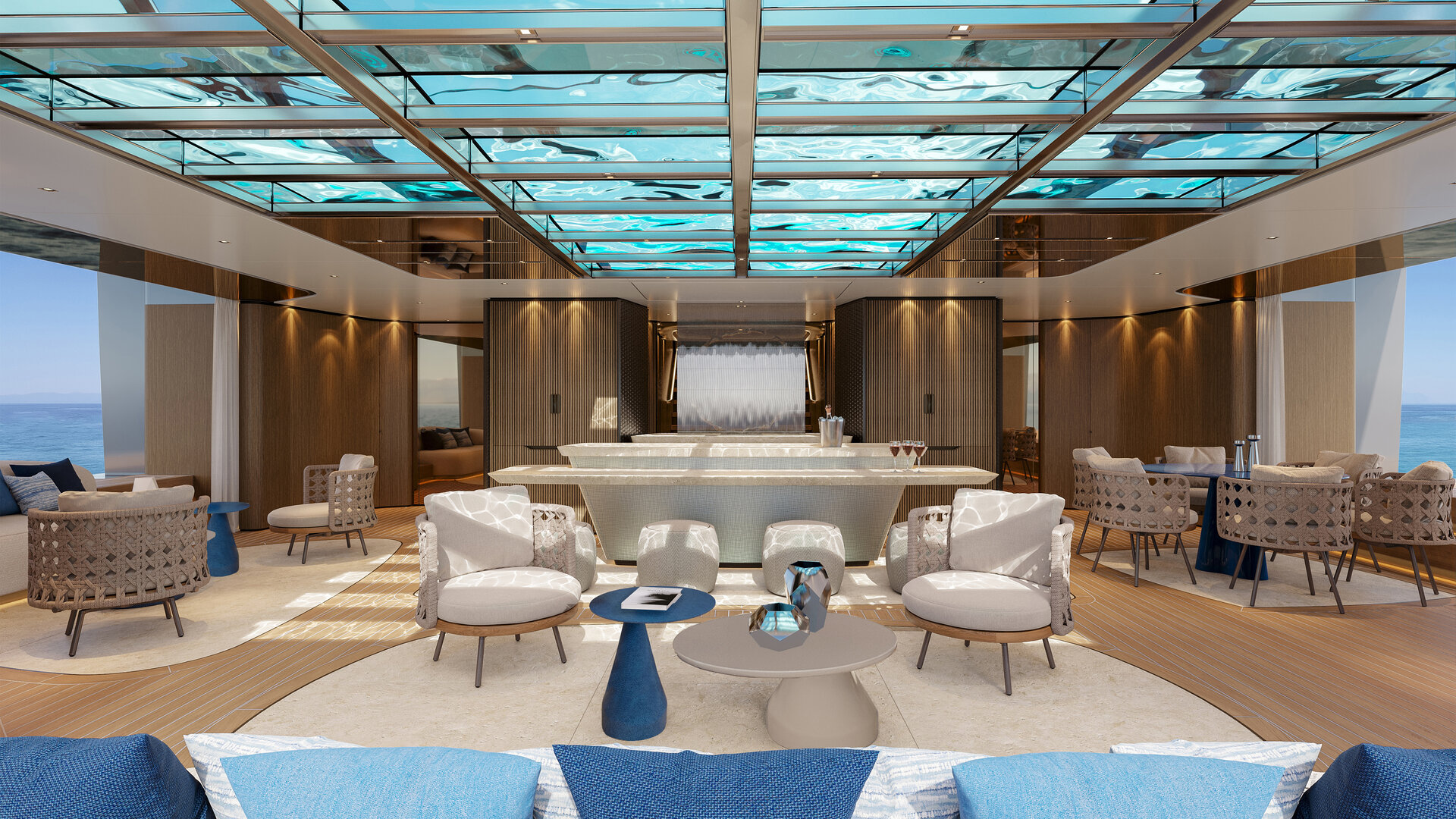 On the main deck, guest accommodation can be found alongside the yacht’s elegant main salon. The salon itself combines a relaxed lounge and cinema area with a separate dining zone that seats up to 14 guests, divided by a sleek bar unit. Together, these areas span 130 square metres and feature sliding glass doors on both sides, opening the space to sea views and a gentle breeze. Aft, a spectacular glass-bottomed pool bathes the beach club below with natural light, creating a calm connection to the sea.