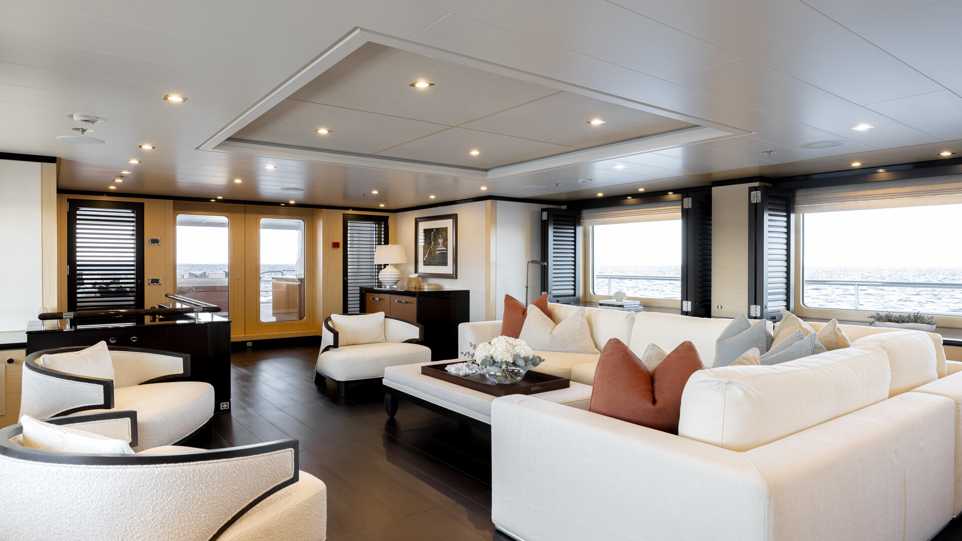 The interior of the GRACE motor yacht is designed by Nuvolari & Lenard. It features a timeless contrast of light furnishings and dark wood, with plenty of natural light thanks to her ample windows.