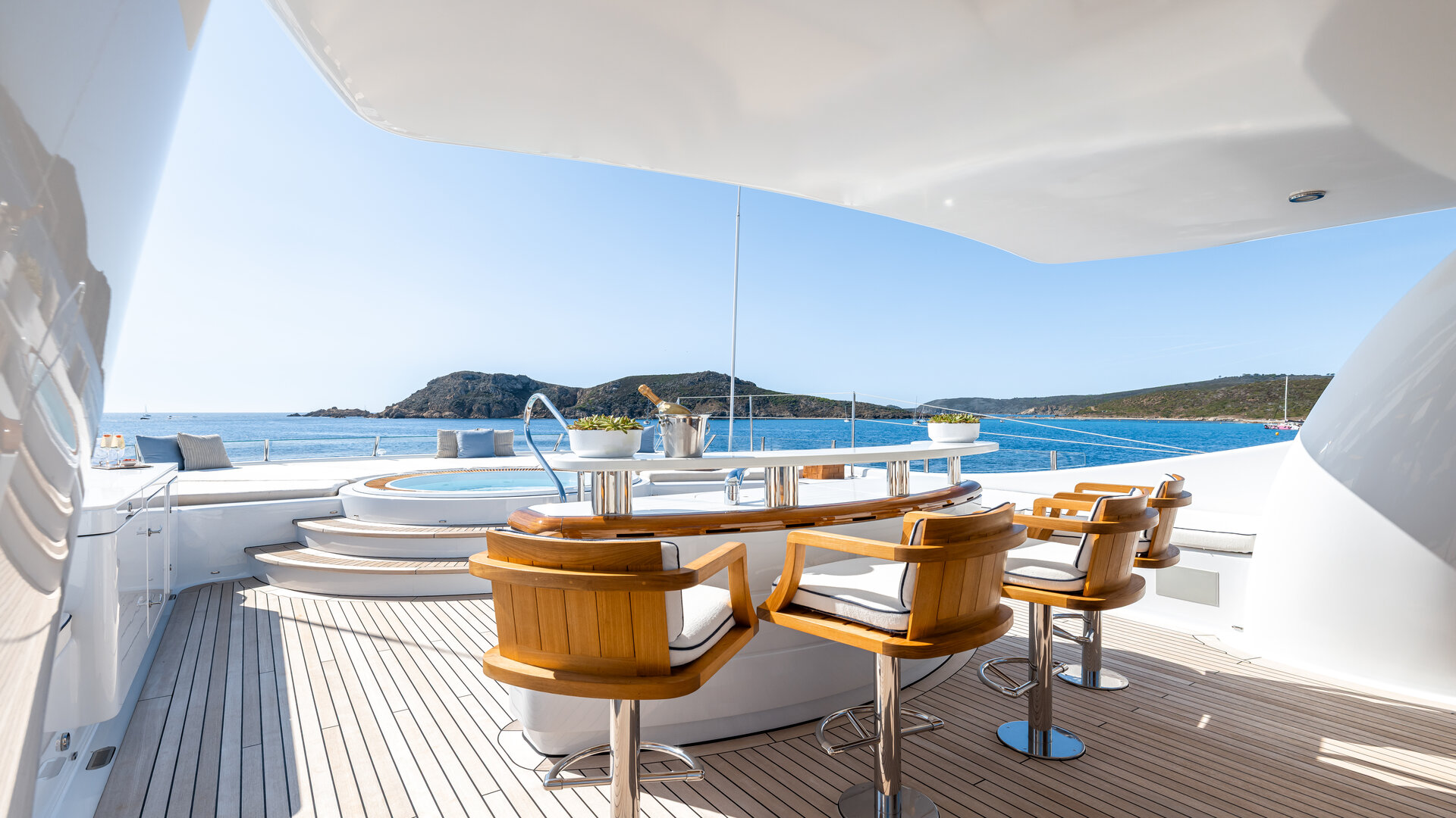 As the evening unfolds, you can enjoy an impeccable meal in the formal dining area that sits 10 guests of the main deck or a barbecue on the sun deck. When you’ve finished, you can head to the full-beam sky lounge for a cinema night, take a digestif at the bar or enjoy an evening dip in the Jacuzzi.