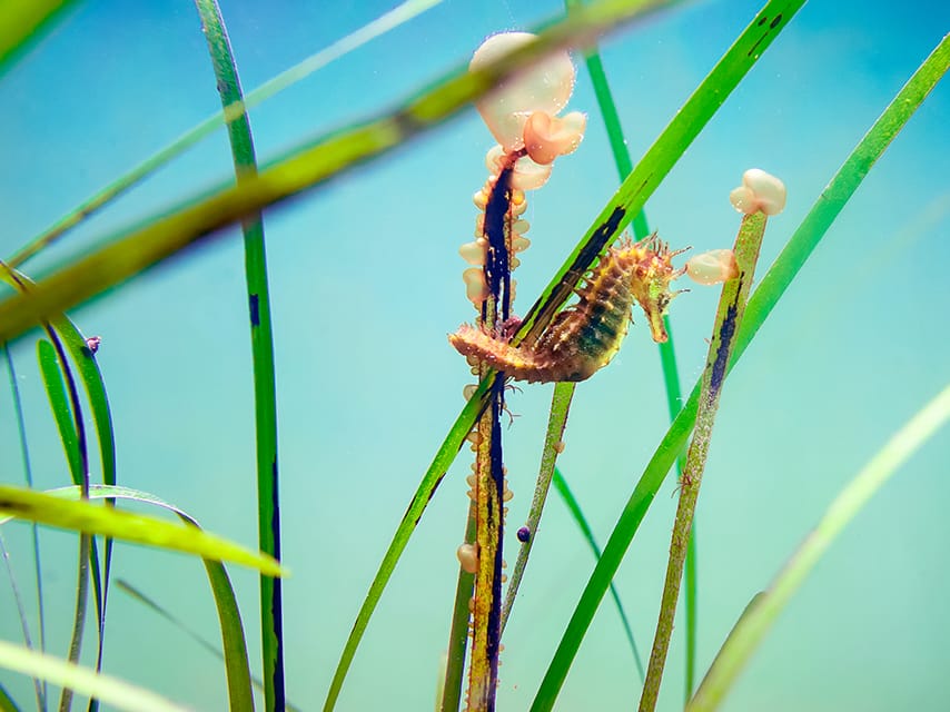 Seagrass meadows host diverse plant, fish and mammalian species. They purify sea water and capture carbon up to 35 times faster than tropical rainforests. Found in shallow waters and up to 20 metres deep, seagrass covers the seafloor and is severely threatened by the dropping of boat anchors.