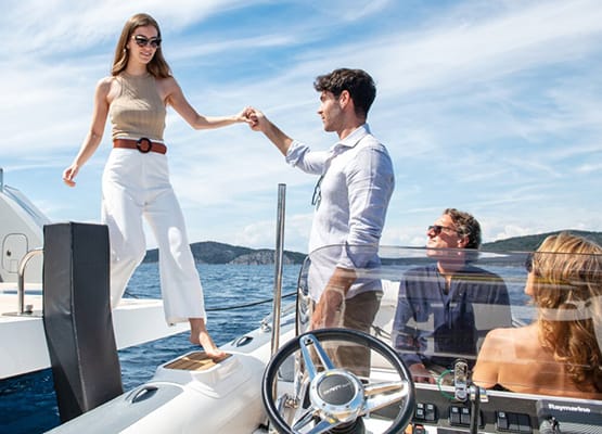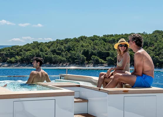 For a first-class sailing charter with the level of luxury worthy of a president, try AQUIJO, which comes with a beach club with sea-view Jacuzzi, sauna, and steam room, plus an alfresco dining table fit for a state banquet.
