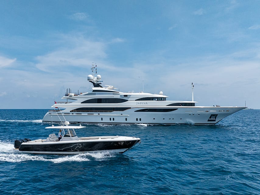 JAGUAR is all about leisure onboard. She boasts a spacious sundeck and deluxe Jacuzzi which is complemented by sun pads to create the perfect space for rest and relaxation. Additionally, she includes a sit-up bar, reclining sun loungers with parasols and an alfresco dining arrangement, giving guests the space for the perfect day, all in the one spot.