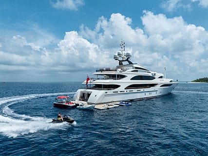 She comes with lots of luxury amenities, including a sun deck Jacuzzi, an indoor gym that can convert to a massage room, and a raft of water toys, including wave runners, Seabobs, paddleboards and more.
