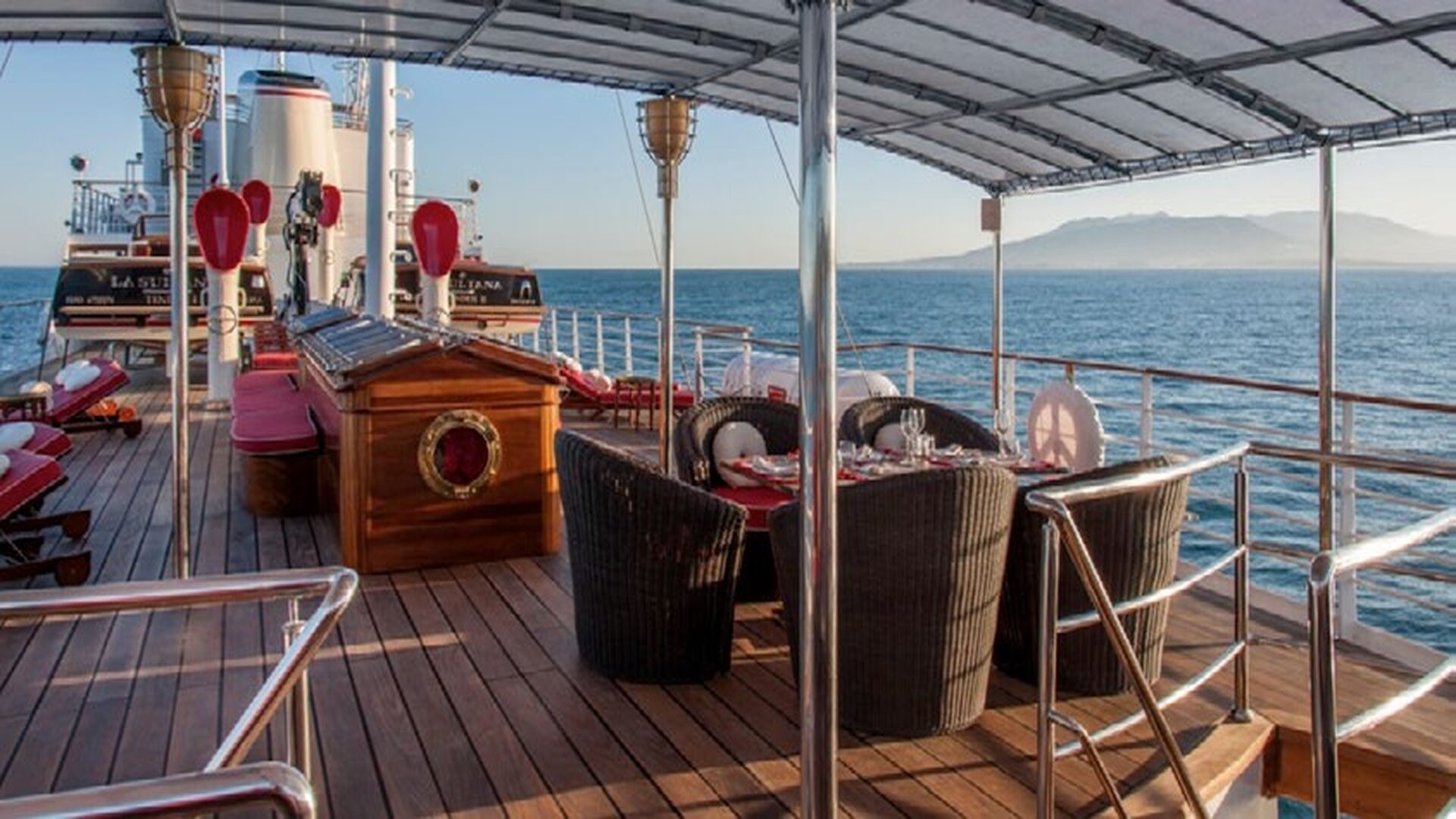 She offers numerous outdoor areas to enjoy lounging and alfresco dining, with a seawater Jacuzzi plus an outdoor terrace that can host up to 120 guests for a sensational event charter.