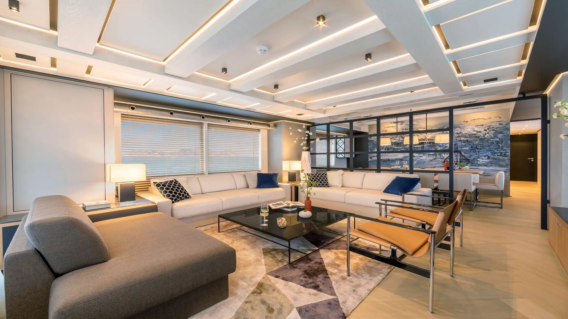 Her salon features a large lounge with plenty of seating and a separate dining table forward. This area connects directly to the beach club and luxury sauna area and is complemented with its sea-view seating area. Keeping all living spaces on one deck creates exceptional volume for a 28-metre yacht.