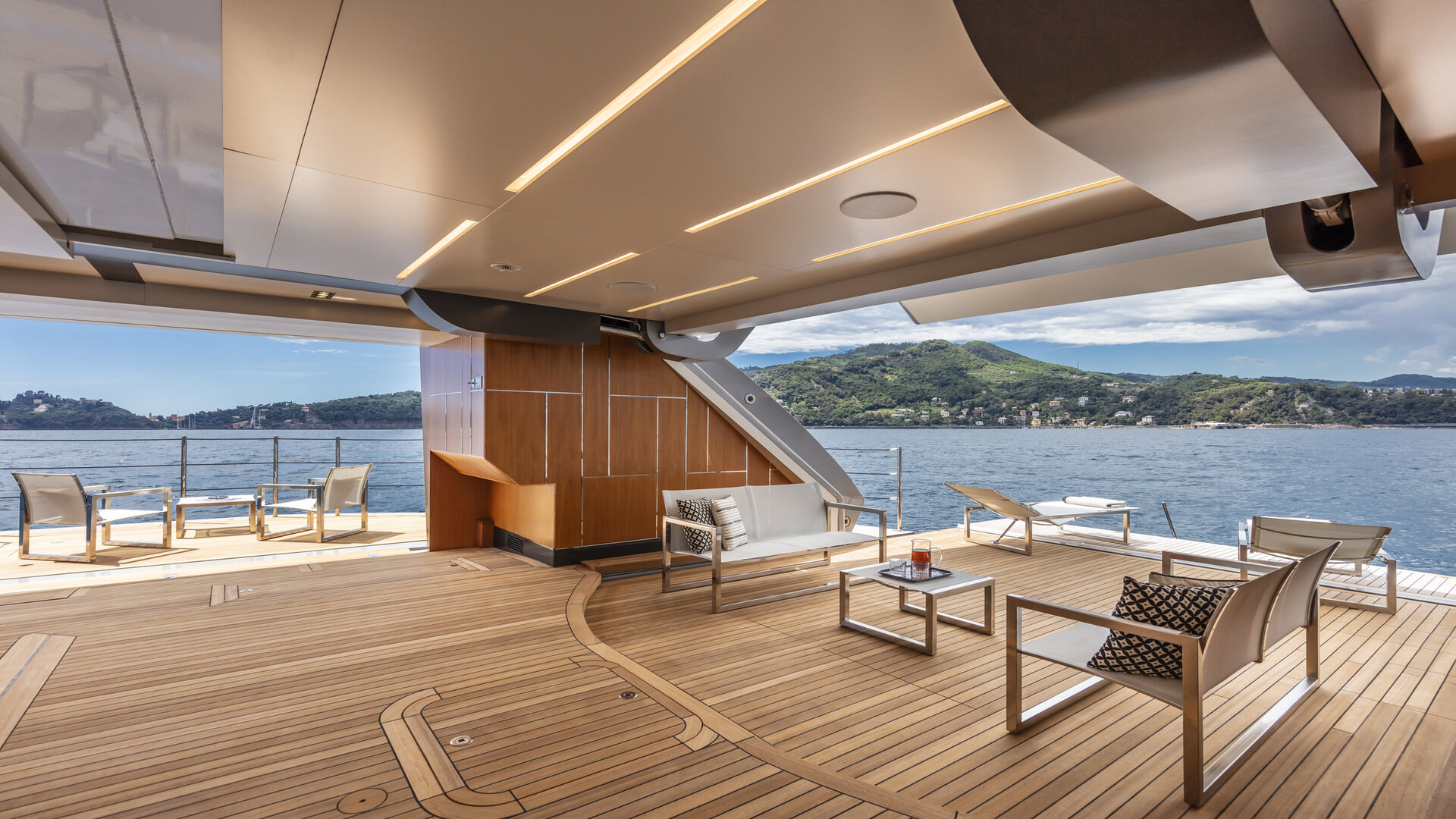 CHORUSLINE yacht is all about experiencing the outdoors thanks to her enviable exterior spaces that elevate the luxury yachting experience. She includes a large sun deck, complete with Jacuzzi and sun pads on the fore deck, and an al fresco dining area and bar, sheltered by awnings with relaxed loungers for an escape from the sun. Her open plan beach club is a true highlight, with a large swimming platform and fold-down bulwarks on the side opening to balconies, creating an oversized on-the-water lounge and the perfect setting to launch her range of toys from.