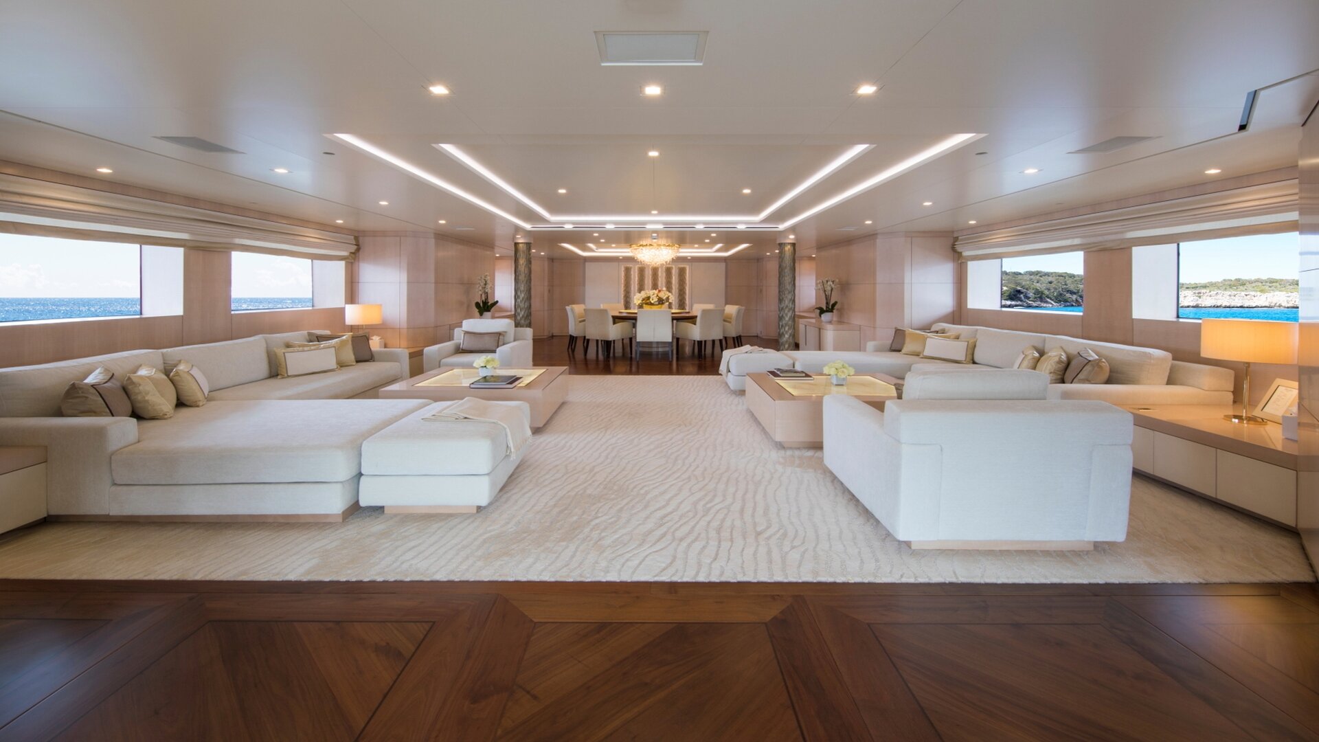 There is a formal dining area round a circular table beneath a statement light forward that comfortably seats 12 and she also comes with a full-beam sky lounge with cosy seating and a games table, plus a cinema.