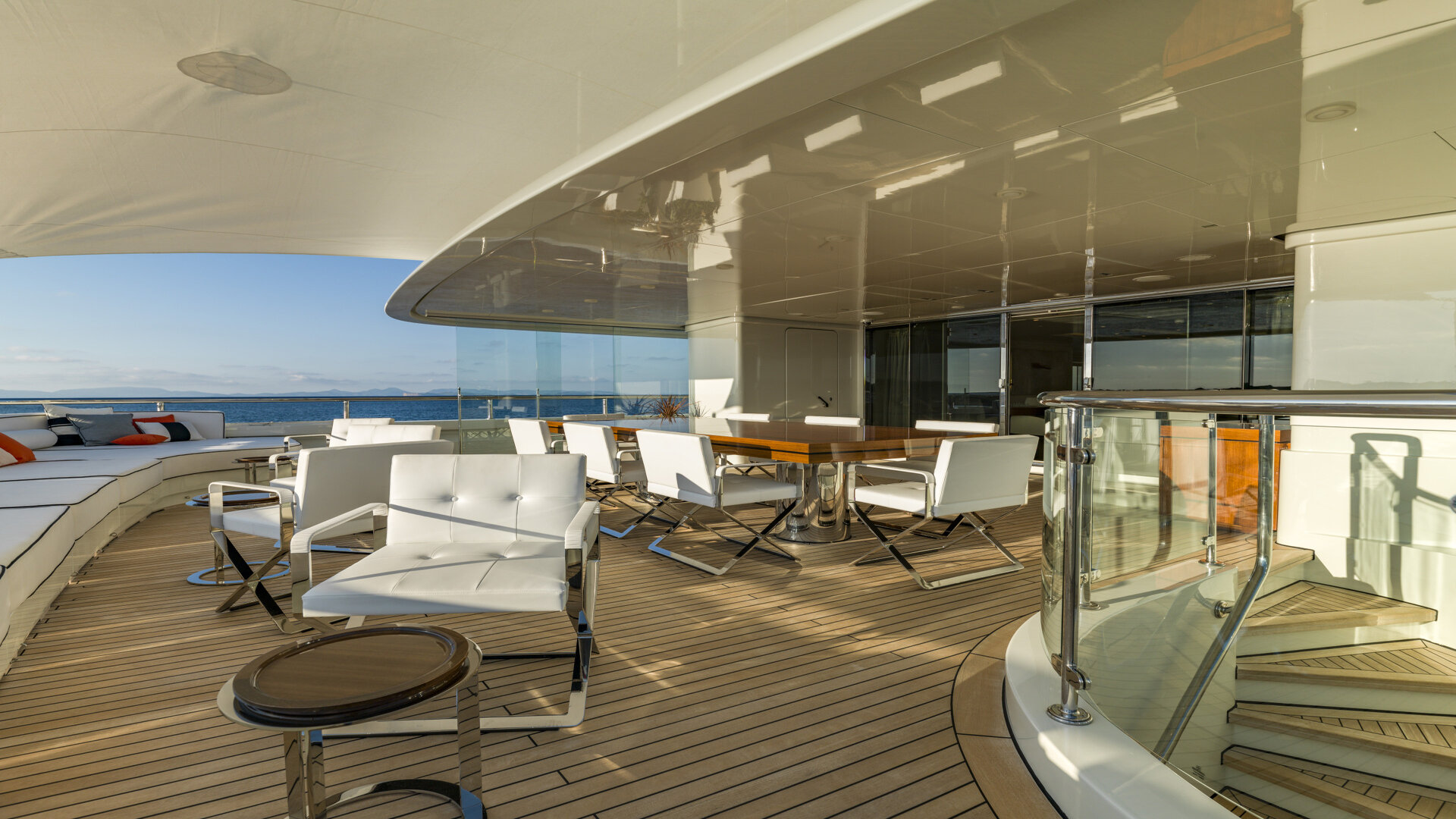 Out on deck, ROMA motor yacht features a superb sun deck and a large pool surrounded by daybeds and a wet bar. An air-conditioned gym nearby provides sea views for guests as they workout. Alfresco dining can be enjoyed on the upper deck terrace.