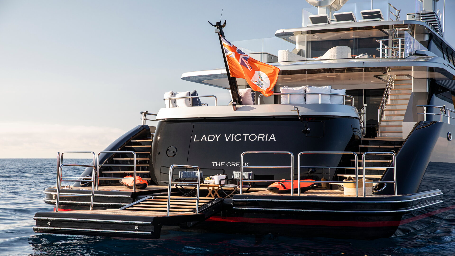 LADY VICTORIA yacht for sale comes with an impressive array of toys and tenders. Her toys include a pair of Seabobs, a Sea Doo 300 jet ski, wakeboards, skis, diving equipment and compressor, along with inflatable slides and towers. She also comes with a 5.65m Williams Diesel Jet 565 customised tender with towing kit for guests, plus a 4.20m Novurania RIB for crew.