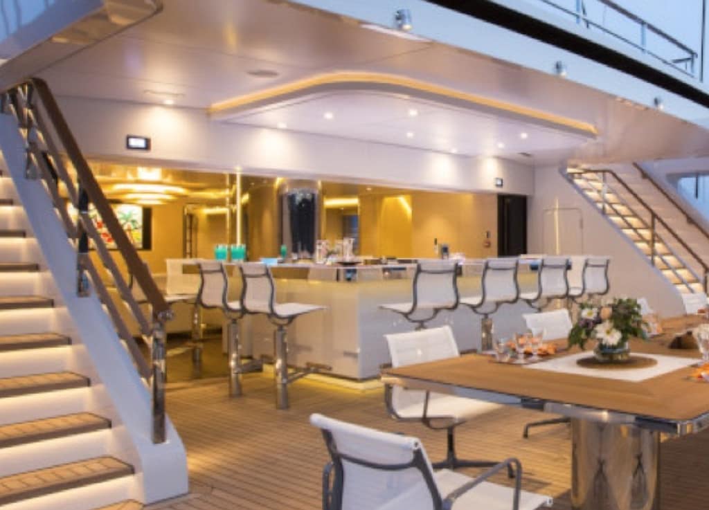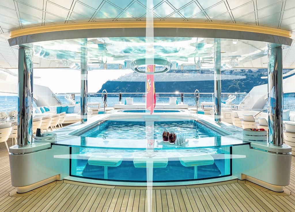 Or perhaps you’d rather the grand presence of the 93m Feadship yacht, LADY S, where by day you can chill out at the beach club with its own Hammam and plunge pool, or dive into the large glass-bottomed swimming pool just above. And, of course, when the fully certified EC 155 helipad is not in use, it makes way for an exclusive after-dark nightclub.