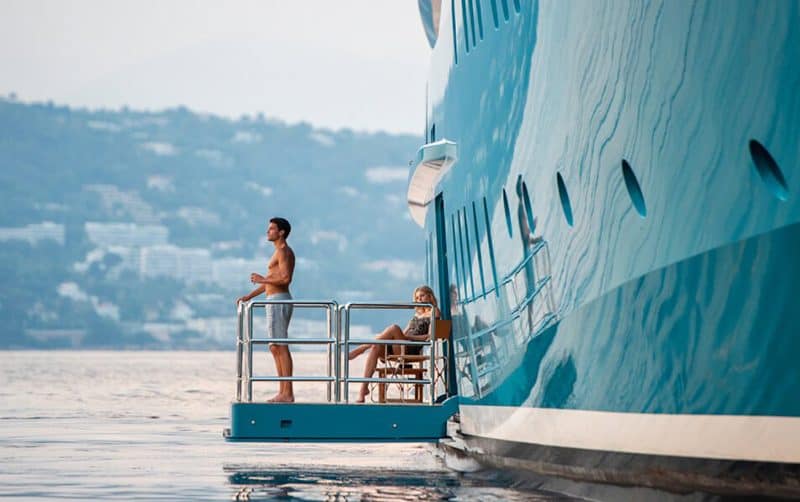 The large fold-down beach club on 43m yacht DIANE is a delightful place to spend a lazy waterside day in the Med, while the sun deck offers a little more privacy.