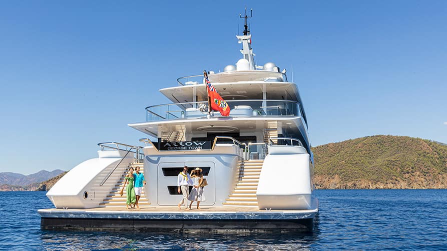 75-metre ARROW is currently available for charter this February ($150,000/day), and has space for up to 12 guests. Launched in 2020, the yacht has all the trappings to seriously impress that special someone, including a full-beam beach club that converts into a sea-level lounge in the evenings, and a cinema with surround sound.